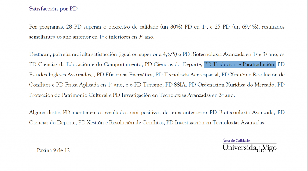 De hecho, desde la coordinación del Doctorado T&P nos llena de satisfacción y orgullo comunicar, en esta web del Grupo de Investigación y del Programa Doctoral Internacional Traducción & Paratraducción (T&P) de la Universidade de Vigo, que nuestro programa doctoral internacional se ha situado entre los cinco primeros programas de doctorado de toda la Universidade de Vigo al haber obtenido la máxima puntuación (5 sobre 5) tal y como puede consultarse en la profusa información de los datos recopilados disponibles en las tablas del documento Excel publicado por el área de Calidad de la Universidade de Vigo